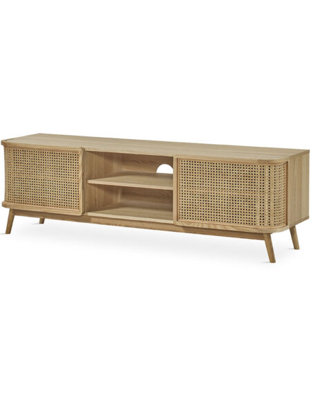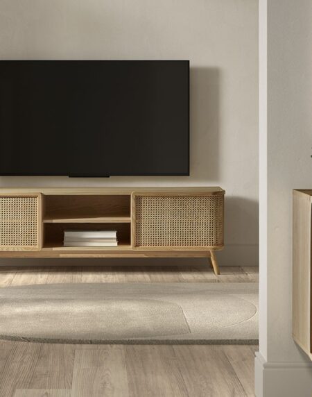 Mueble de TV en madera de roble natural junto a dos estantes abierto encima. Funcionalidad y almacenamiento.