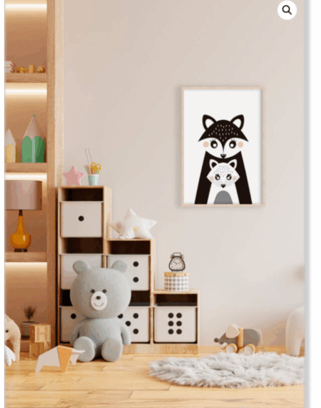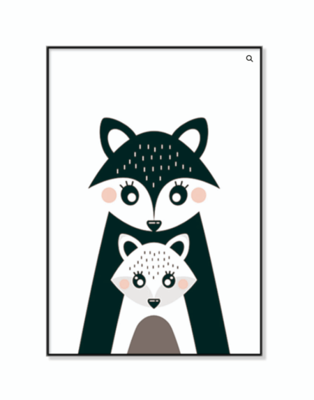 Obra de arte infantil minimalista con dos mapaches en un diseño estilizado. Figuras simplificadas y colores suaves, perfectos para cuartos infantiles, ambientes lúdicos o entornos artísticos desenfadados.