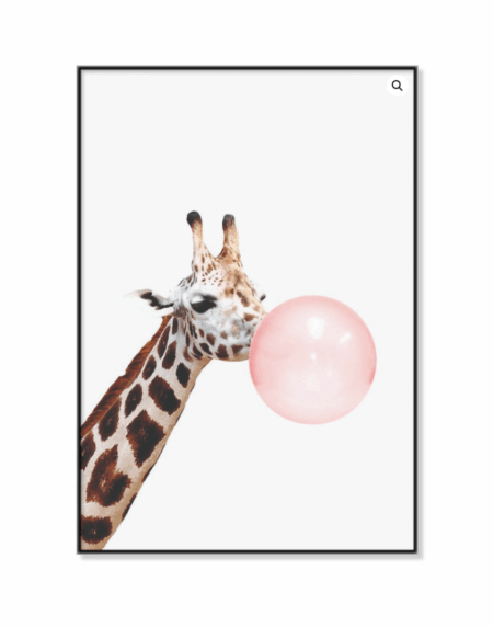 Ilustración divertida de una jirafa haciendo una gran burbuja de chicle rosa, transmitiendo creatividad y humor. Perfecta para decoraciones alegres o fanáticos del arte animal con un estilo desenfadado.