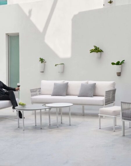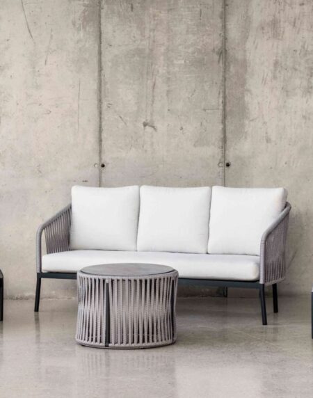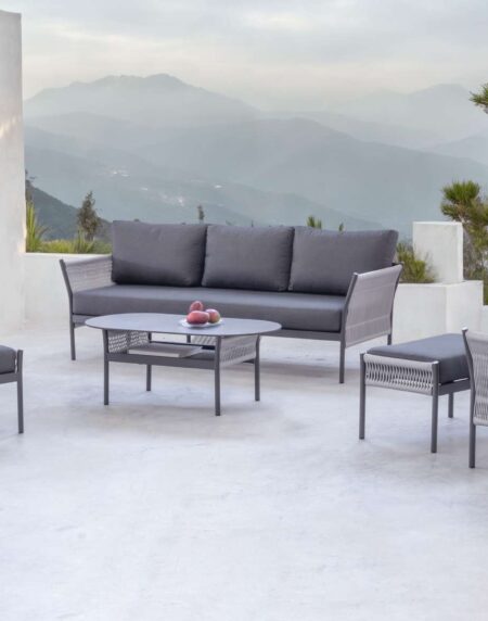 El Conjunto de Aluminio y Cuerda Aldara-8 es la elección perfecta para quienes buscan estilo, confort y durabilidad en su espacio exterior. Este elegante set incluye un amplio sofá de tres plazas, dos sillones individuales y una mesa de centro, ideal para disfrutar de momentos de relajación en el jardín, la terraza