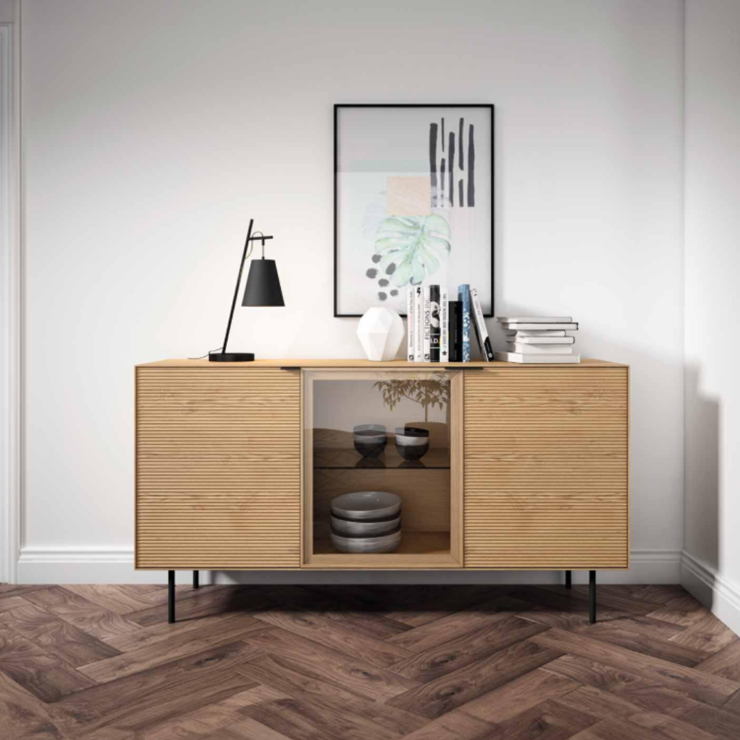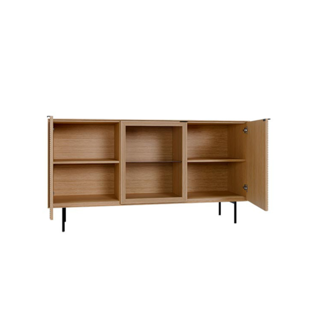 El aparador TULSA con 2 puertas de madera y 1 puerta de cristal combina funcionalidad y diseño con un equilibrio perfecto entre lo natural y lo sofisticado. Su estructura en chapa de roble y los frentes en madera maciza de roble rayado aportan textura, calidez y una presencia elegante.