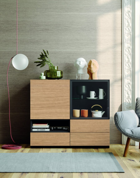 Buffet formado por Piedra Mate, Roble Vintage-Humo y Atracita Metalizado.