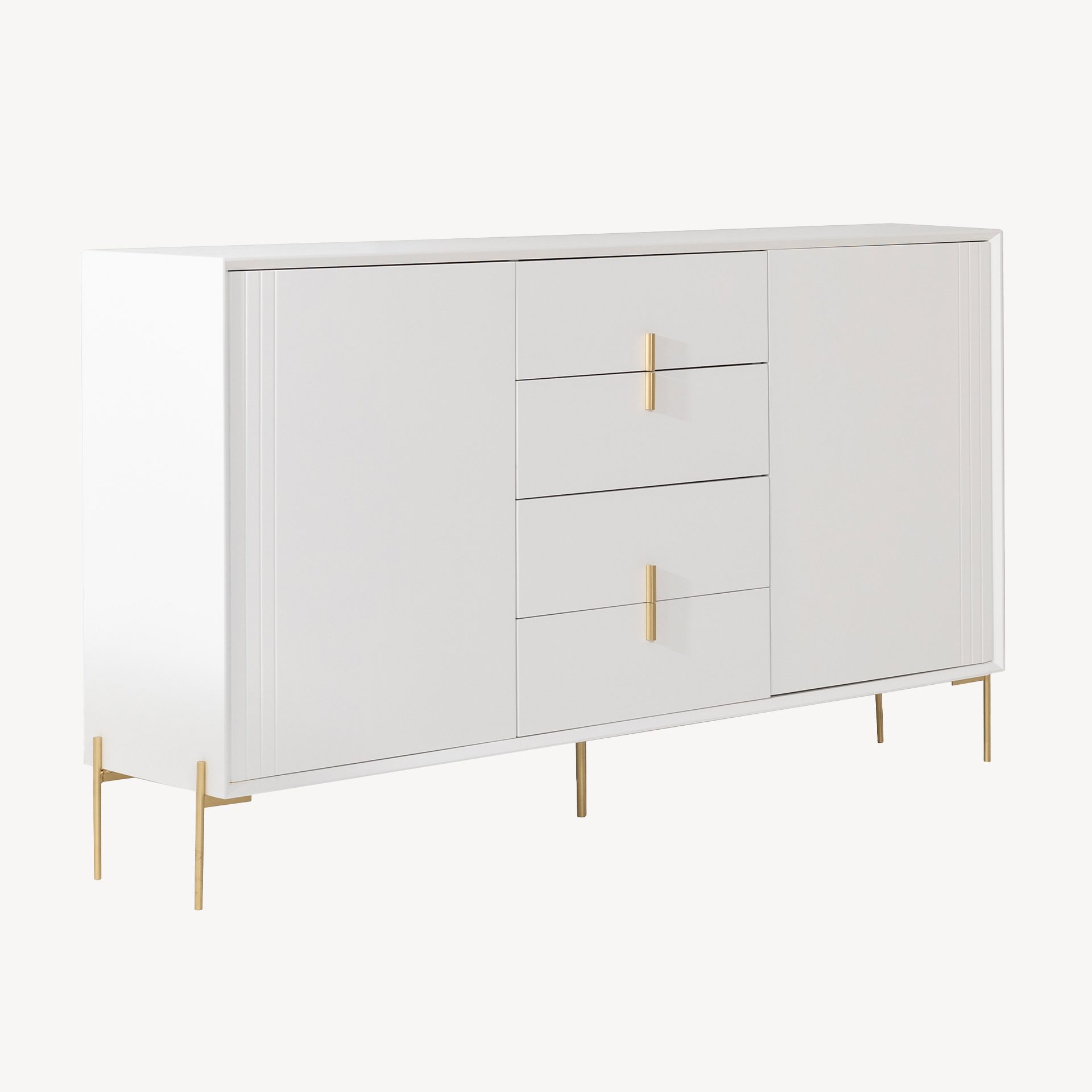 La colección de muebles Milán es una línea moderna que combina elegancia y funcionalidad en cada pieza. Cada mueble de la colección está construido con madera lacada en blanco, lo que le confiere un aspecto limpio y contemporáneo. La madera lacada en blanco crea un efecto brillante y pulido que agrega luminosidad y amplitud a cualquier espacio. Una de las características distintiva de los muebles de la colección Milán son las patas de metal, que aportan un toque de sofisticación y estabilidad. Estas patas metálicas están cuidadosamente diseñadas para complementar el estilo moderno de los muebles y brindar un soporte resistente y duradero. Tanto las patas como los tiradores de los muebles de la colección Milán ofrecen una opción de personalización, ya que se pueden elegir en dos acabados diferentes: negro u oro. Los tiradores en negro añaden un contraste elegante y audaz, mientras que los tiradores en oro aportan un toque de lujo y glamour. Esta opción de elección permite adaptar los muebles a diferentes estilos de decoración y preferencias personales.