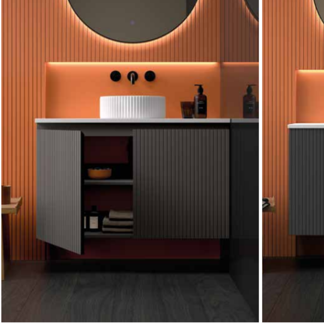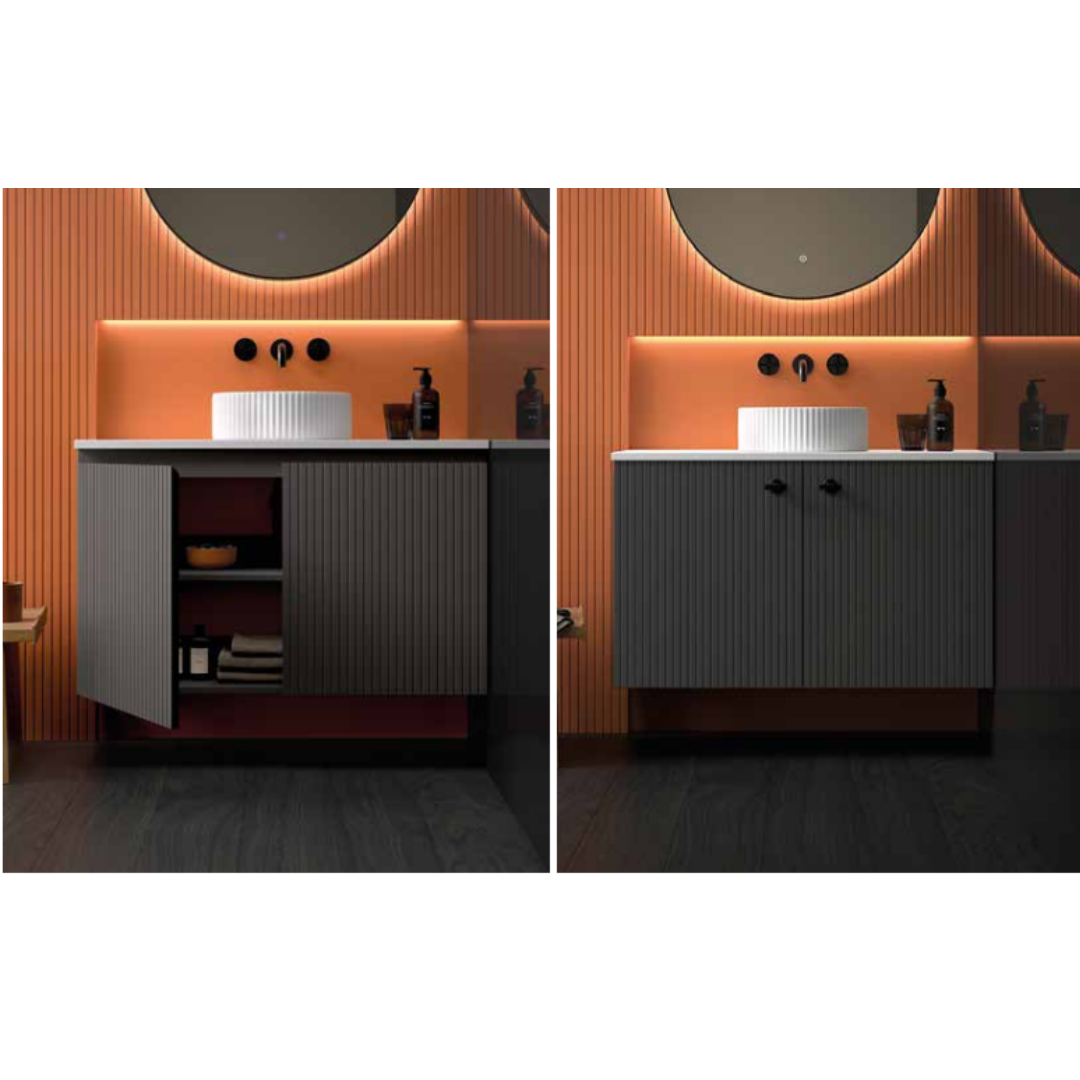 ADVANCE 07 destaca por su color y detalles cuidados. Un mueble lacado compacto, con el patrón rayado Twin, genera un efecto visual que parece un solo cajón, aunque en realidad son dos puertas perfectamente unidas