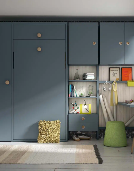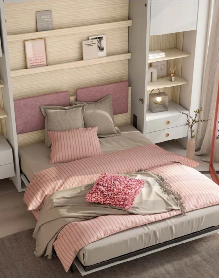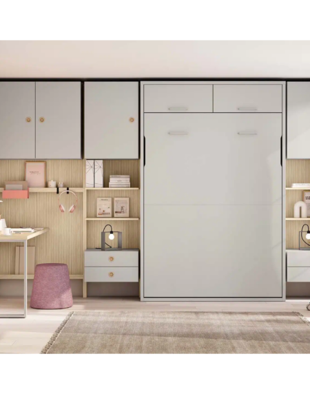 La cama abatible horizontal Up&Down te permite tener un espacio más amplio en la habitación cuando la cama está cerrada, la estantería que hay encima es ideal para tener todos los libros más a mano.