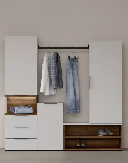 Le sigue un armario de doble puerta con apertura batiente con baldas para la ropa doblada, y debajo dos huecos diáfanos para el calzado o unas cestas para objetos varios.