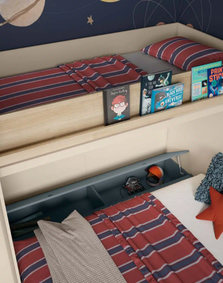 El escritorio de la parte inferior de la cama, es de fondo 61cm, ideal para realizar los deberes o estudiar. Se trata de un escritorio curvo, lo que nos permite ganar un poquito más de espacio hasta la escalera. Para el escritorio, puedes elegir si quieres un módulo con cajones, o simplemente quieres un escritorio y otro tipo de mueble auxiliar para mover de un sitio a otro de la habitación.