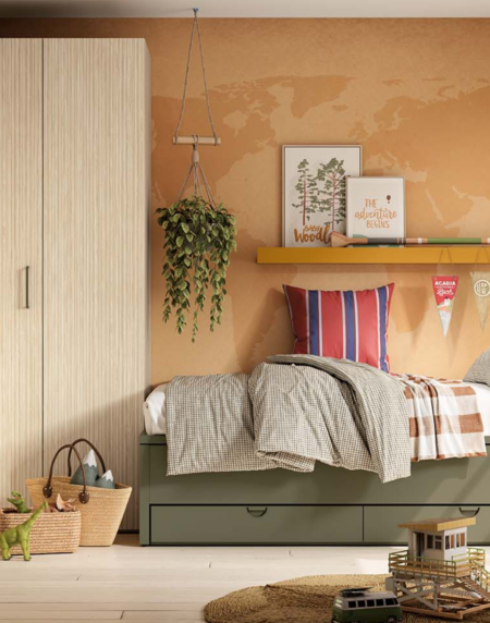 Si tu objetivo es mantener el orden en el dormitorio, tus mejores aliados serán los muebles con mucho espacio para el almacenaje. Esta cama tiene cajones inferiores, y el armario consta de 5 módulos distintos para toda tu ropa y complementos.