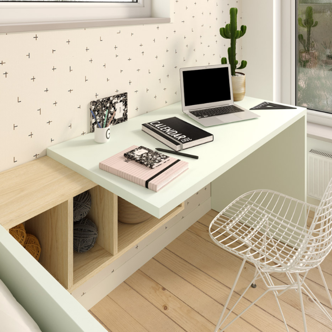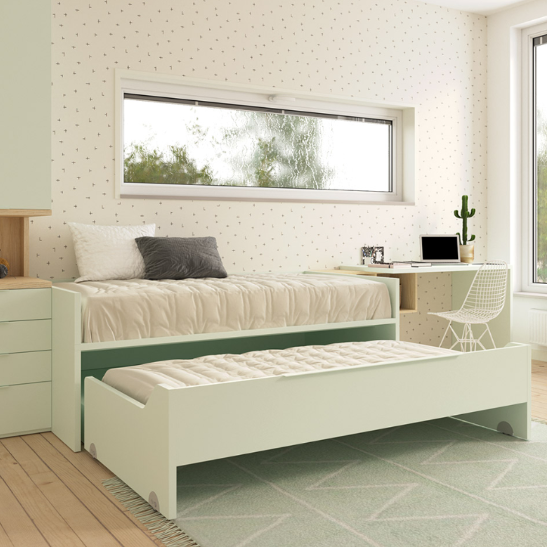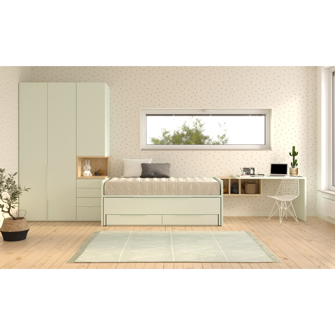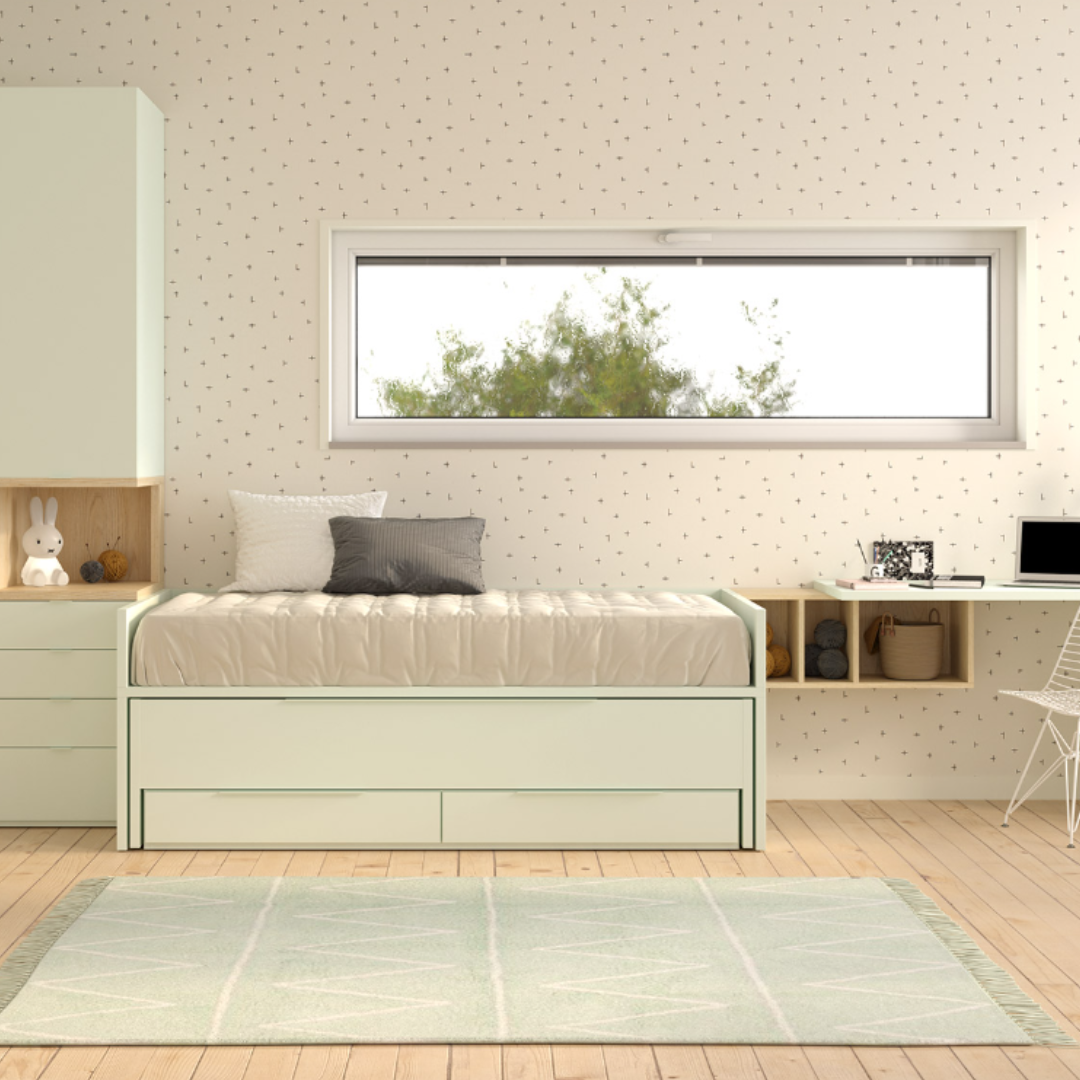 Nueva, actualizada y completa composición con armario, escritorio y cama nido. El armario de 100cm dispone de dos puertas lisas. También contamos con otro armario de 50cm con altillo, hueco distanciador y módulo con 4 cajones. El compacto de 190cm x 90cm cuenta con una cama extraíble y una cajonera con 2 cajones.
