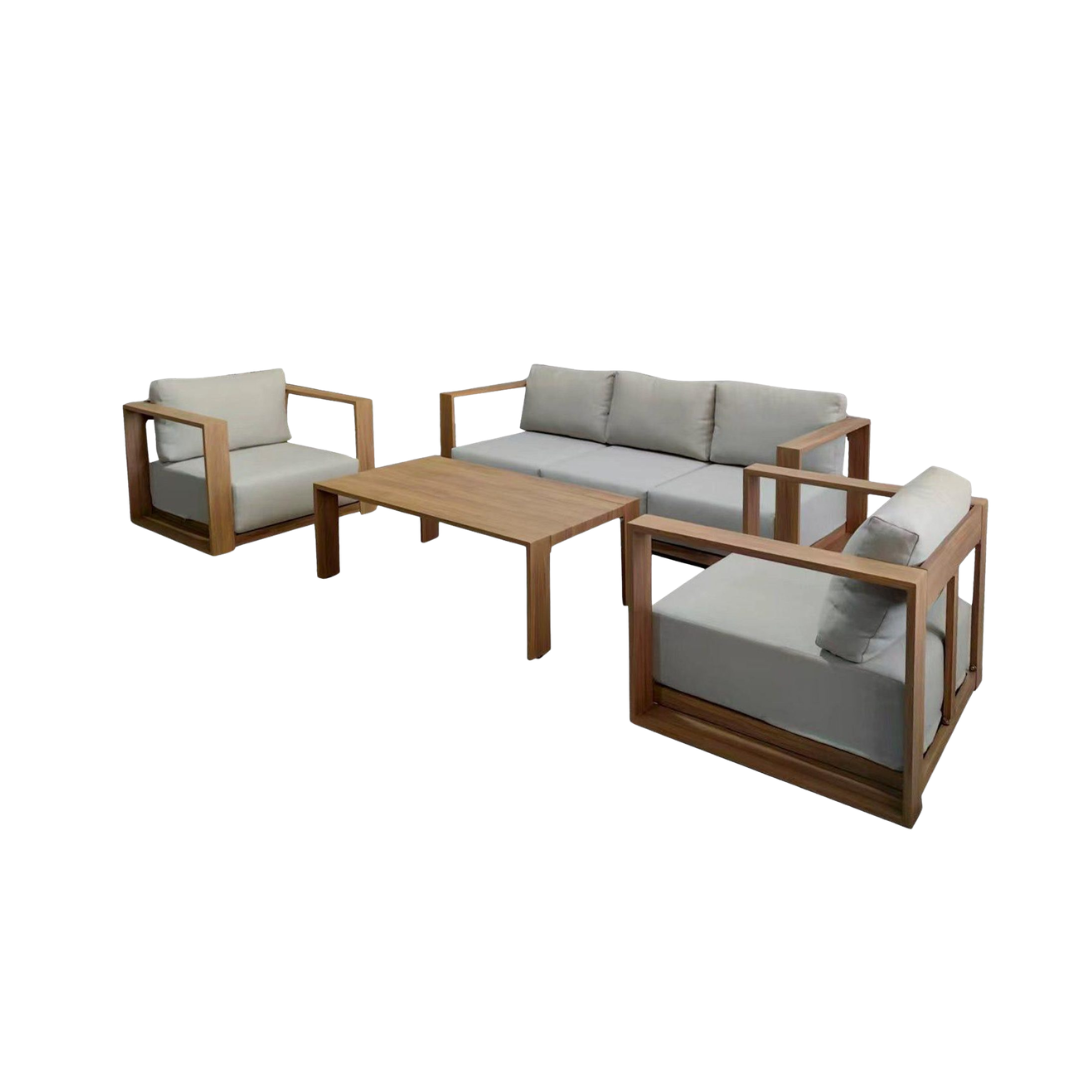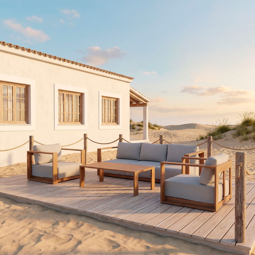 El conjunto exterior Altea es la elección ideal para quienes buscan combinar comodidad, diseño y resistencia en sus espacios al aire libre. Está compuesto por un sofá, dos butacas y una mesa de centro, ofreciendo todo lo necesario para crear un ambiente acogedor y funcional en terrazas, jardines o porches. La mesa está fabricada en aluminio con efecto madera, un material ligero pero muy resistente a la intemperie, que aporta un aspecto natural y elegante. Su diseño práctico facilita la colocación de bebidas, libros o accesorios decorativos. Los asientos incluyen cojines en tejido beige, suaves al tacto y fáciles de combinar con distintos estilos decorativos. Gracias a su estética moderna y su gran confort, el conjunto Altea es perfecto para disfrutar de reuniones, momentos de relax o comidas al aire libre con estilo y comodidad.