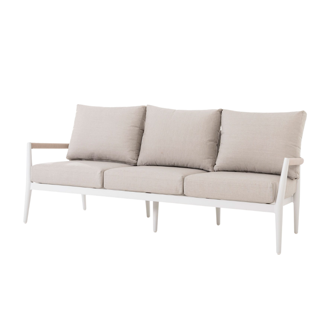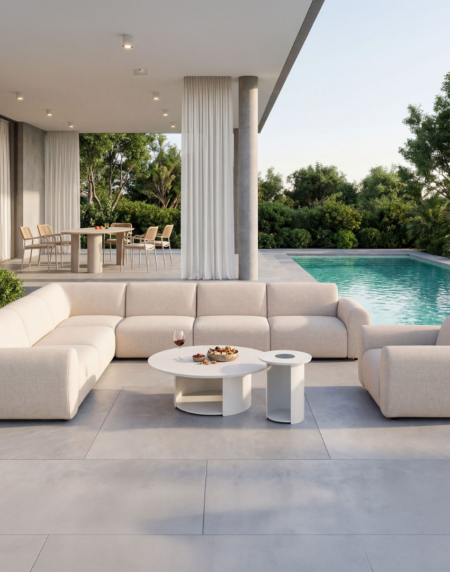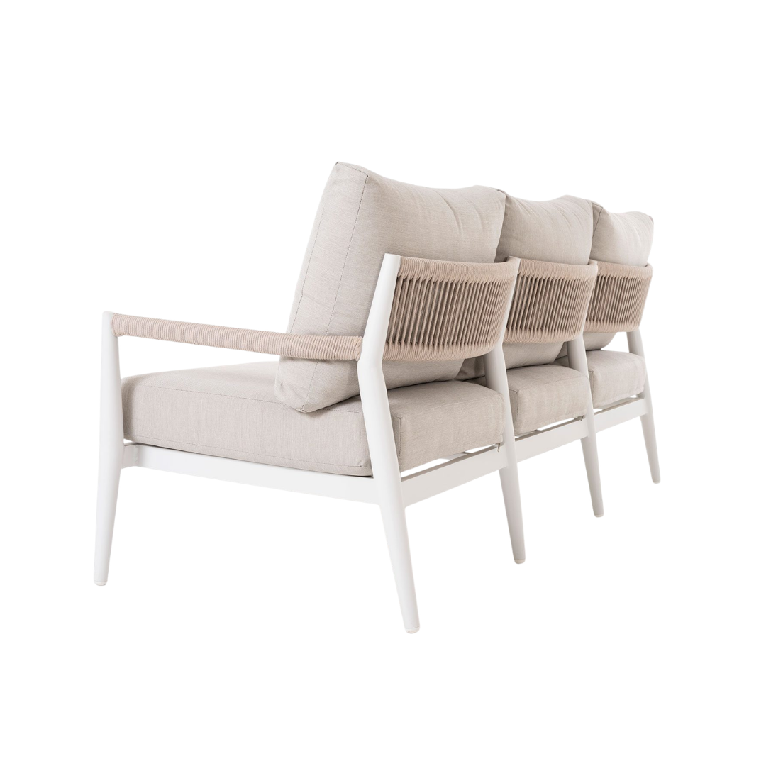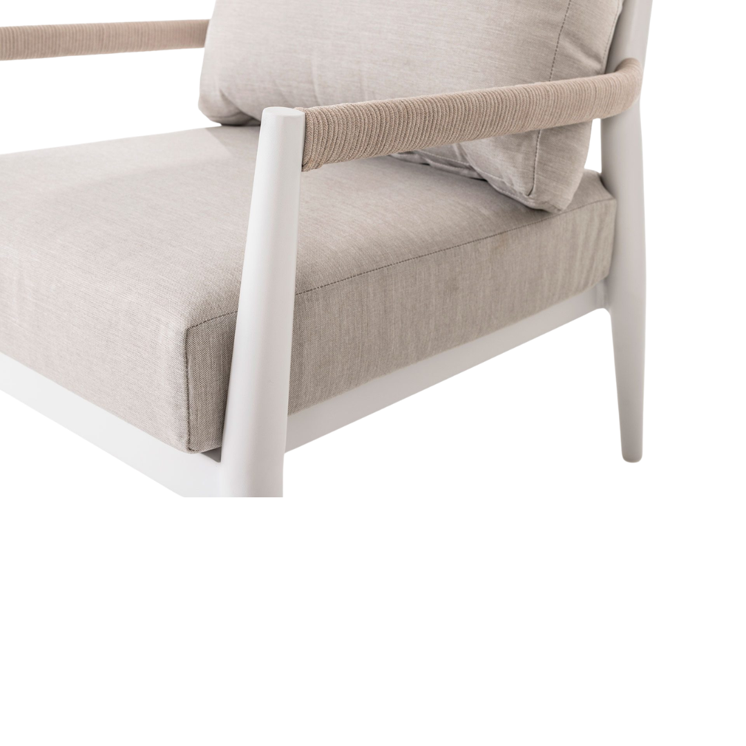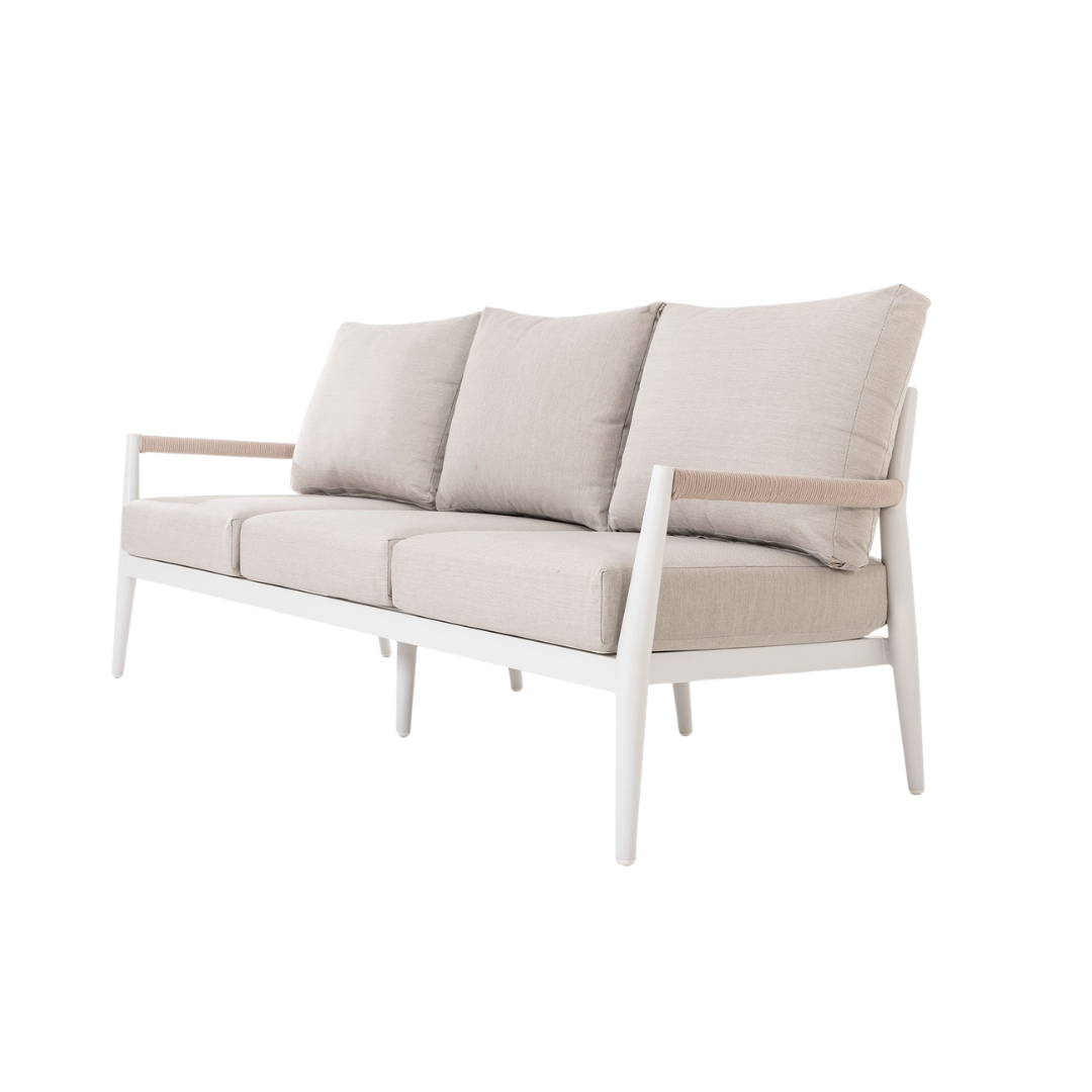 El set de terraza Formentor está diseñado para ofrecer confort y estilo en espacios exteriores. Incluye sofás y una mesa de centro con estructura de aluminio blanco, un material ligero, resistente y de fácil mantenimiento, ideal para ambientes al aire libre. Los asientos en tapizado beige aportan suavidad, comodidad y un contraste elegante que complementa el diseño moderno del conjunto. Su estilo versátil lo convierte en la opción perfecta para terrazas, jardines o porches, creando un ambiente acogedor y funcional. El set Formentor combina resistencia, diseño contemporáneo y confort, ofreciendo la solución ideal para disfrutar de momentos de relax y convivencia al aire libre.