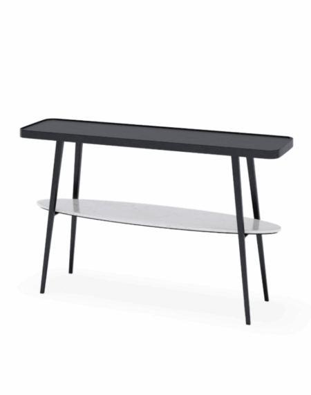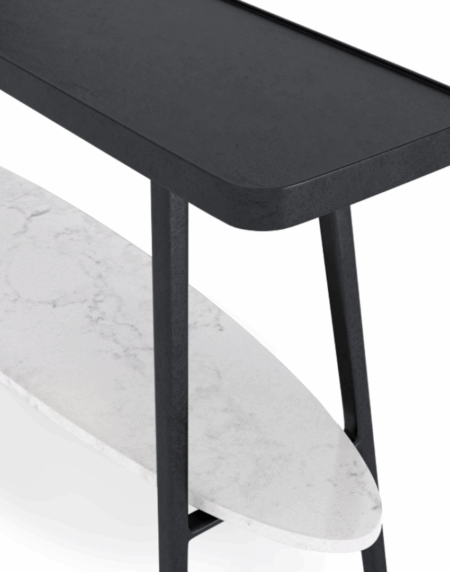 Su silueta minimalista la convierte en una pieza versátil, ideal para recibidores, pasillos o incluso como mueble auxiliar en el salón o el dormitorio. El contraste entre los materiales no solo aporta profundidad visual, sino que también equilibra funcionalidad y estética de forma sutil.