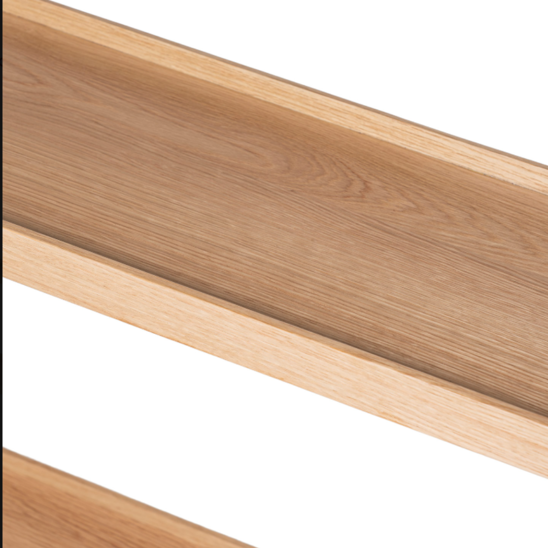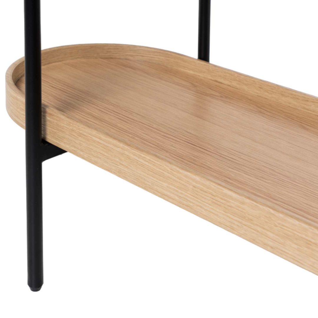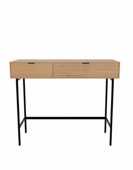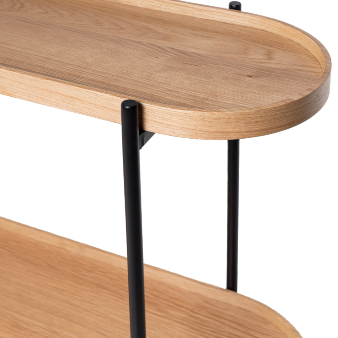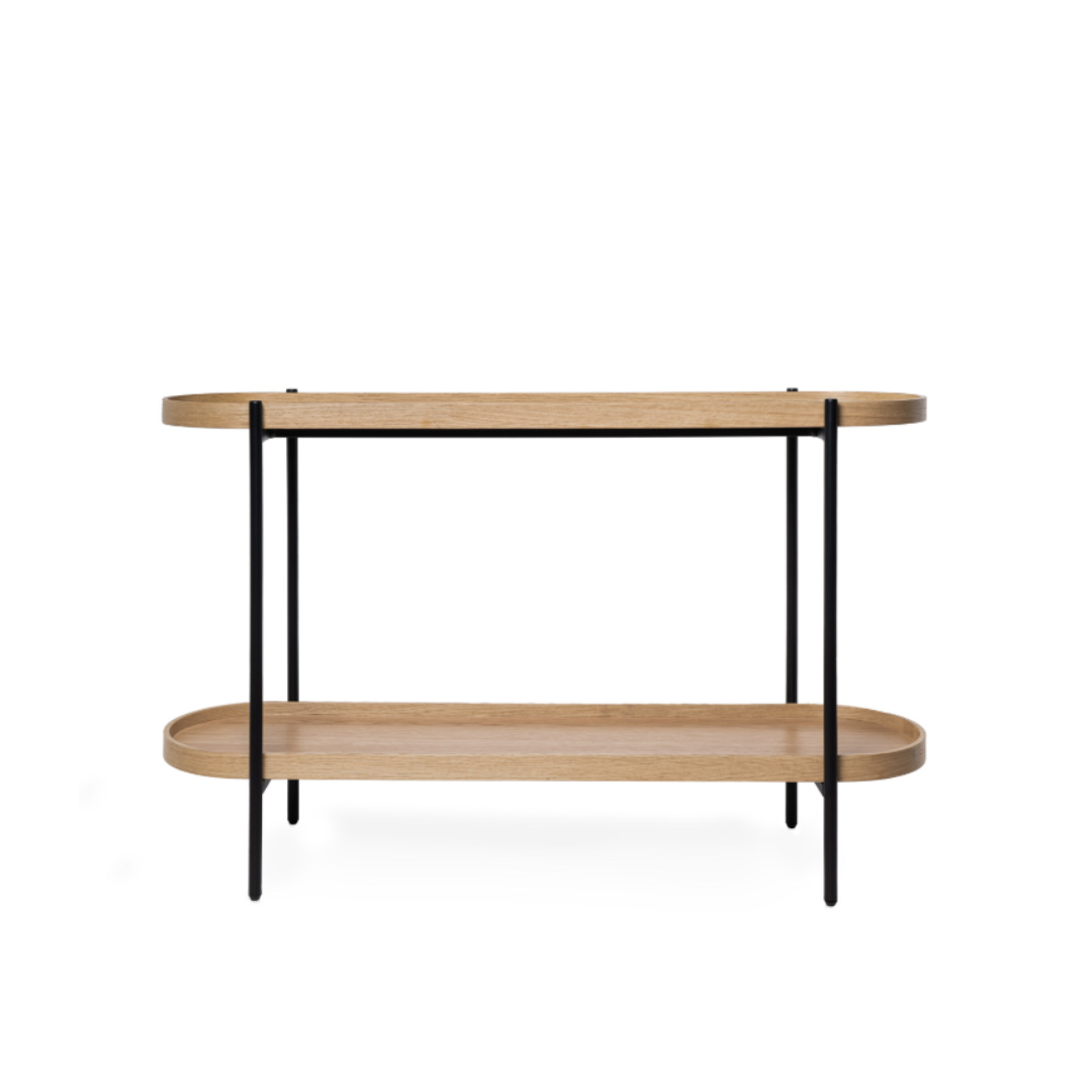 La consola ANANT en acabado roble y negro es la combinación perfecta entre naturalidad y estilo contemporáneo. Su sobre chapado en madera de roble aporta calidez y textura, mientras que la estructura metálica negra añade un toque moderno y sofisticado que realza su presencia en cualquier ambiente.