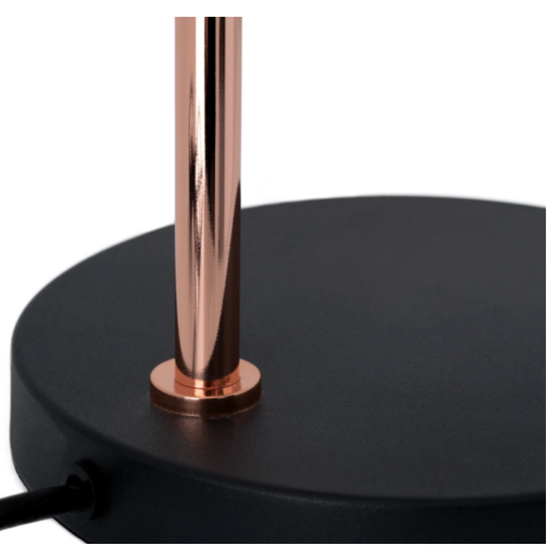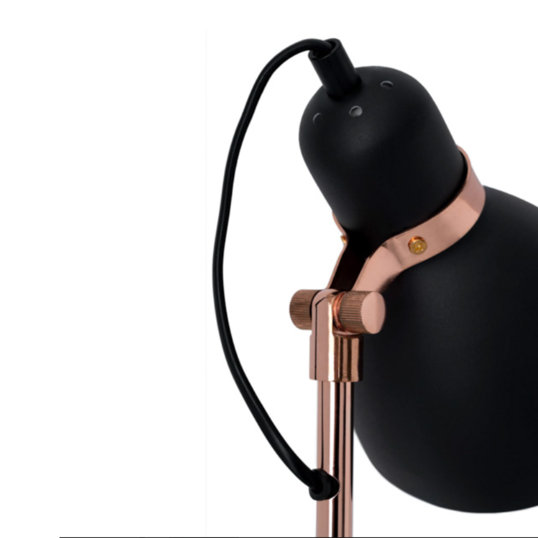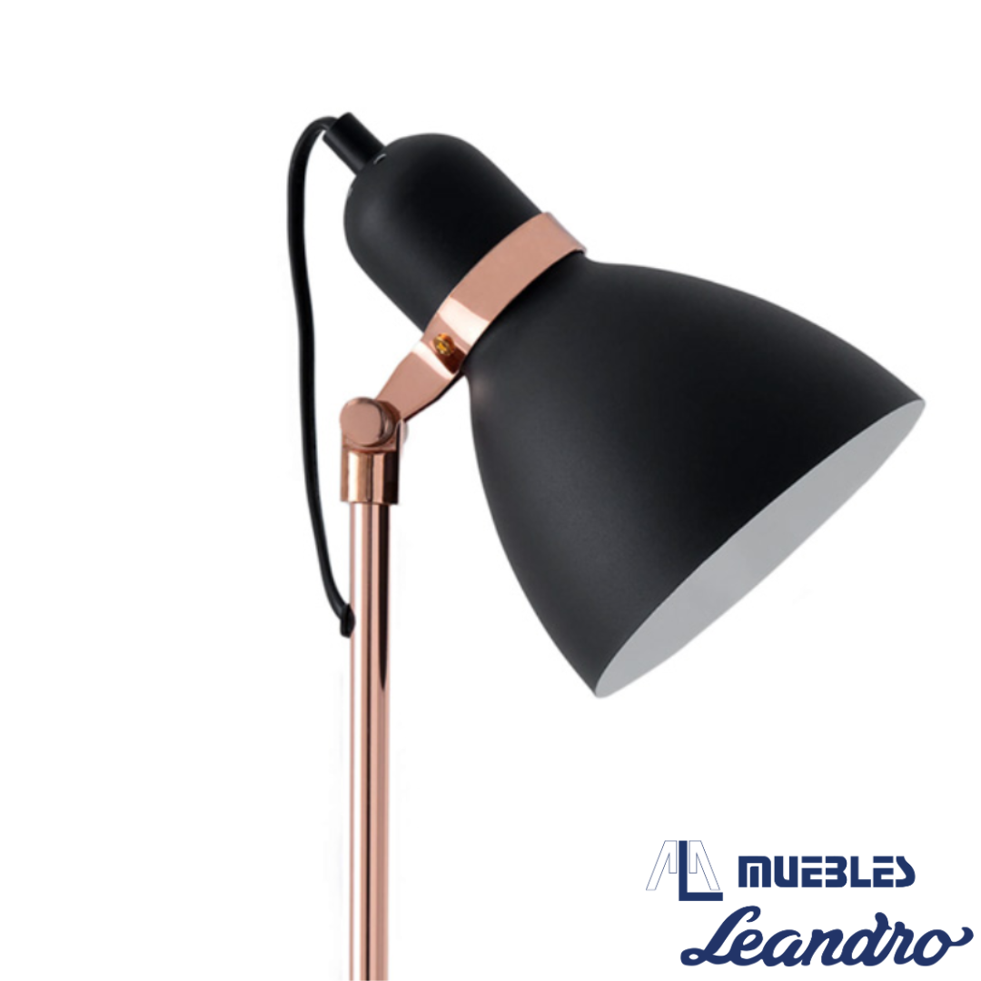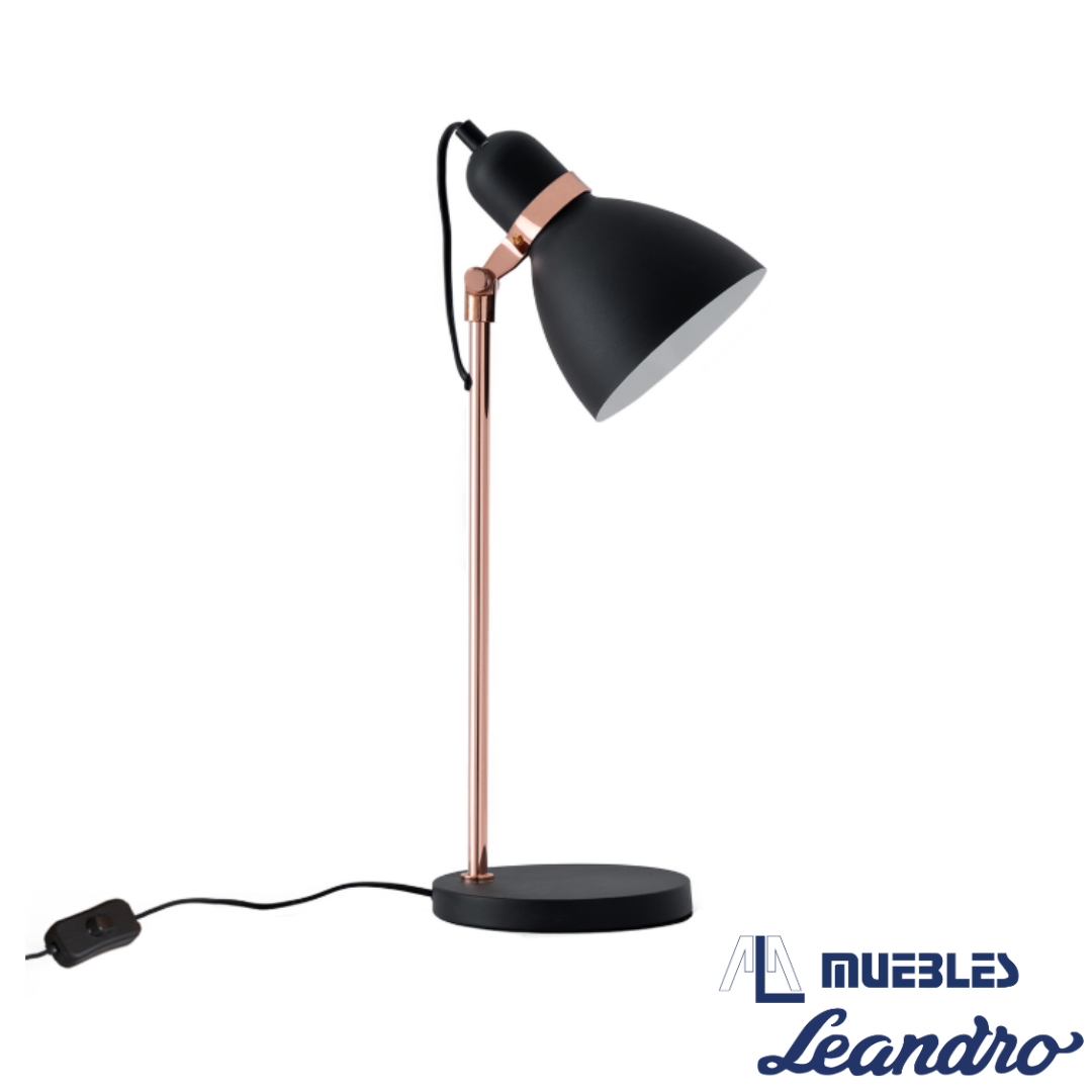 La lámpara de sobremesa GRISEL combina carácter industrial con un toque elegante, gracias a su estructura de metal negro y detalles en cobre metálico que aportan calidez y sofisticación.