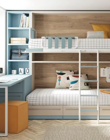 - Una versión con cuatro huecos, que al igual que en la pared interior de las camas abatibles tiene una cincha elástica en la parte superior para sujetar los libros, la agenda y demás material. Debajo hay distintas soluciones para poder almacenar el material de estudio que desees.