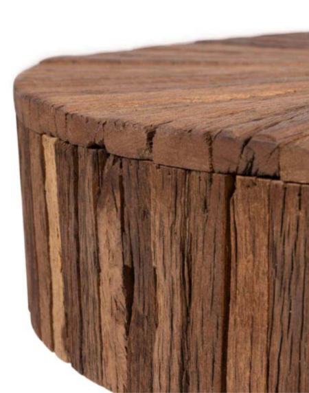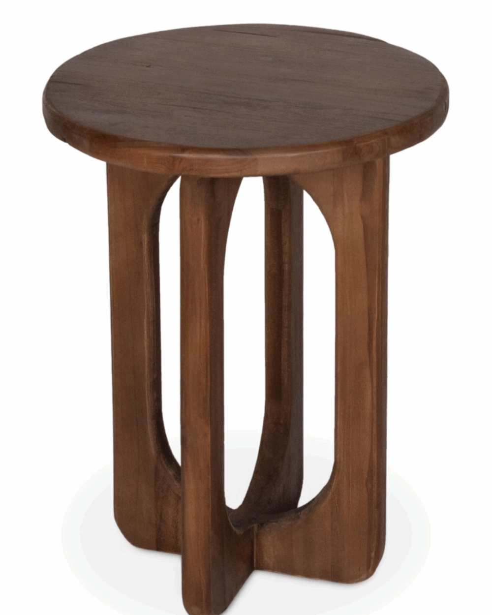 Mesa auxiliar alta fabricada en madera de nogal natural con unas patas de diseño que se pueden ver de diferente aspecto según la perspectiva.