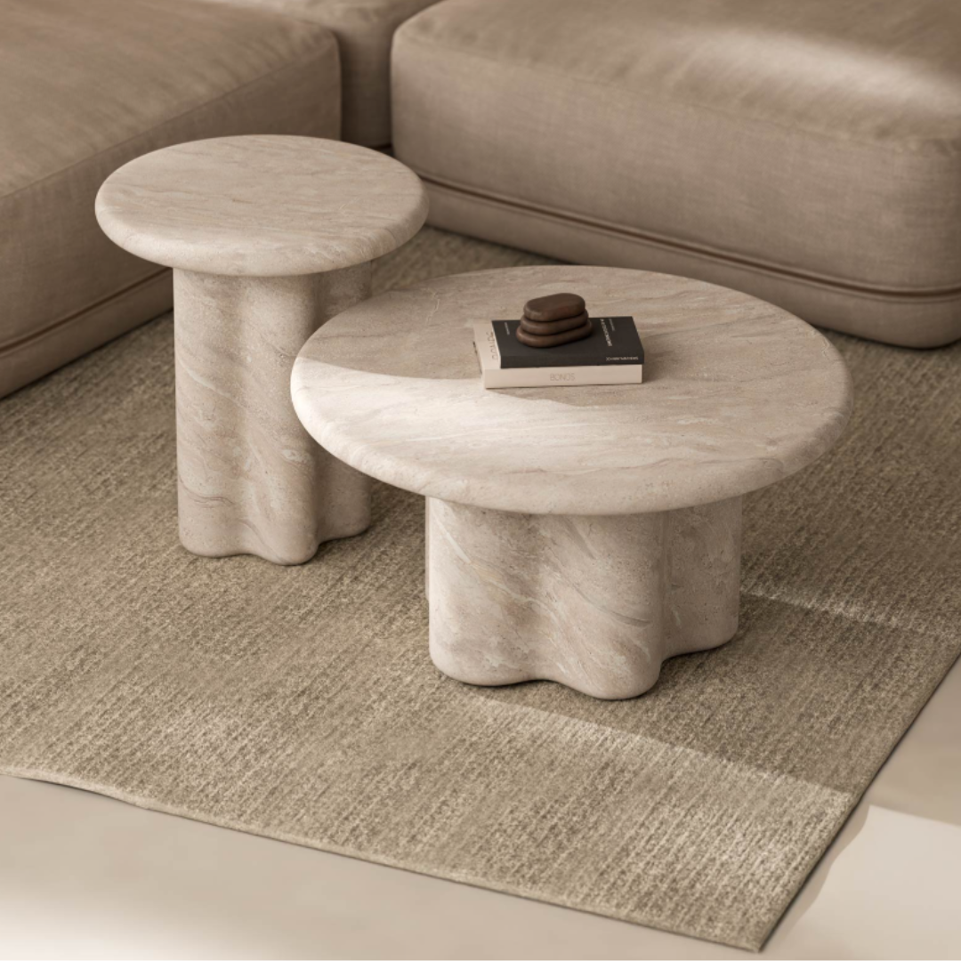 La mesa de centro LUIGI destaca por su diseño elegante y refinado, que combina la fuerza del cemento-GFRC (reforzado con fibra de vidrio) con la delicadeza visual del efecto mármol travertino. Esta combinación de materiales otorga a la pieza un carácter escultórico que captura la atención sin necesidad de excesos decorativos.
