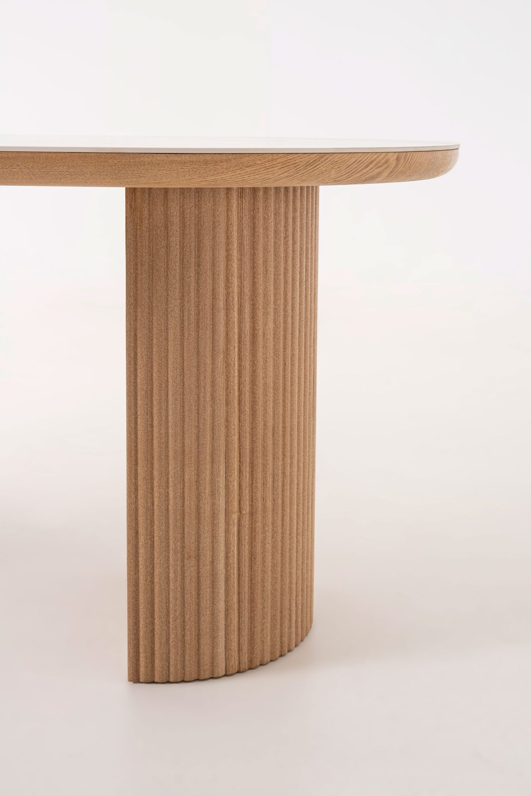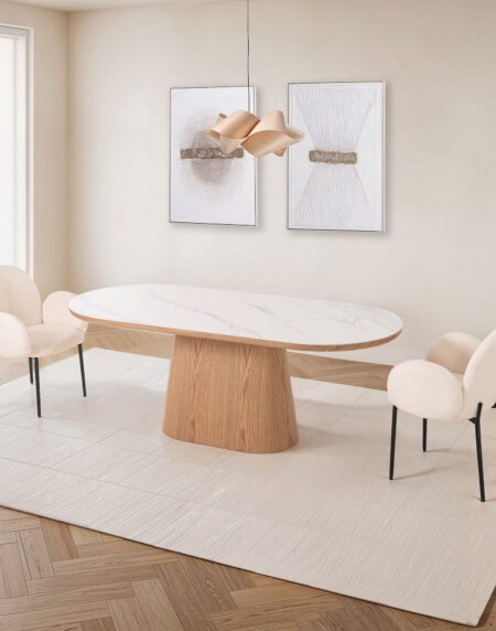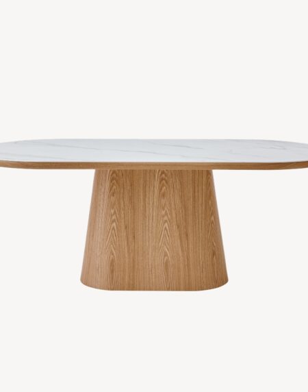 La mesa de comedor ovalada de 200 x 90 x 76 cm combina diseño moderno, funcionalidad y materiales de alta calidad. Su tapa de porcelánico blanco aporta elegancia, fácil limpieza y resistencia, mientras que el pie de chapa de roble con palillería añade un detalle visual sofisticado y natural que realza cualquier comedor. El diseño ovalado permite una distribución cómoda de los comensales, fomentando la interacción y creando un ambiente acogedor. La estructura robusta garantiza estabilidad y durabilidad, ofreciendo un soporte seguro para reuniones y cenas. Esta mesa combina estilo contemporáneo y resistencia, convirtiéndose en un mueble central que aporta funcionalidad, elegancia y carácter al hogar.