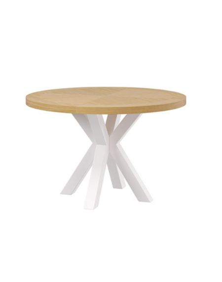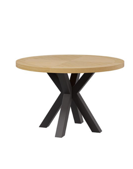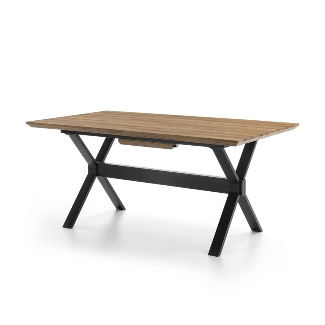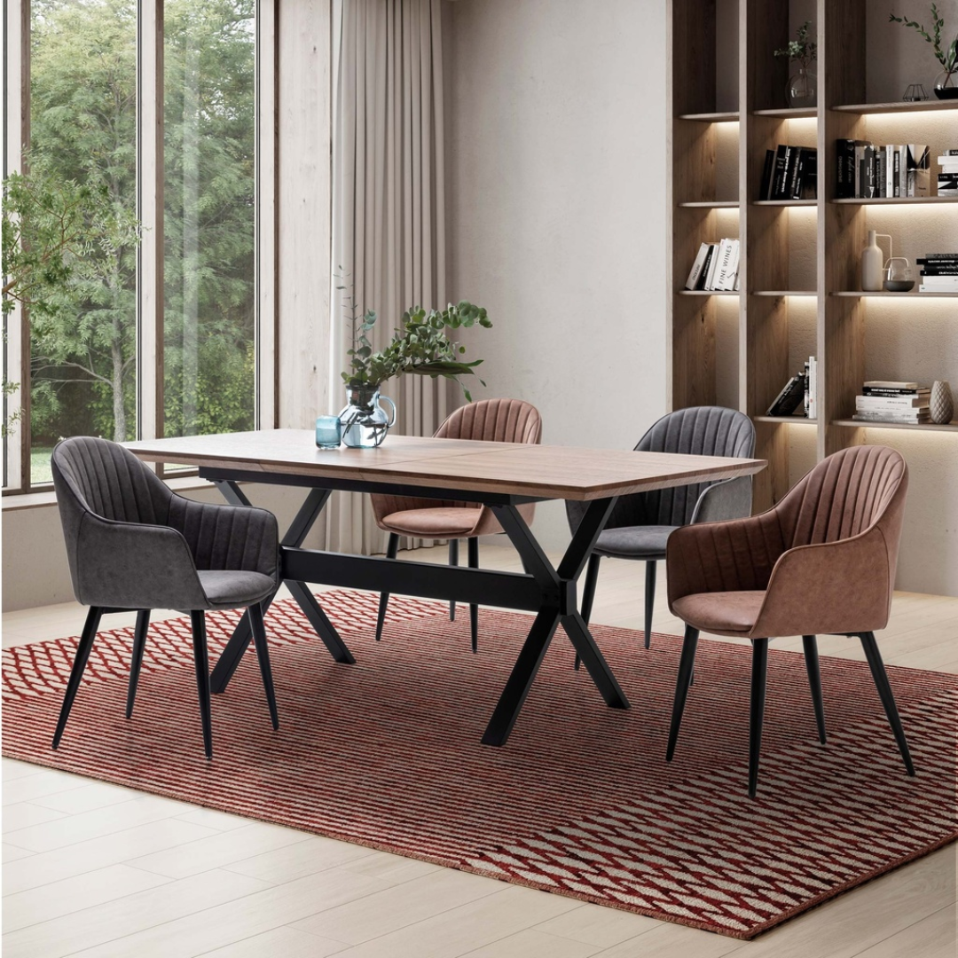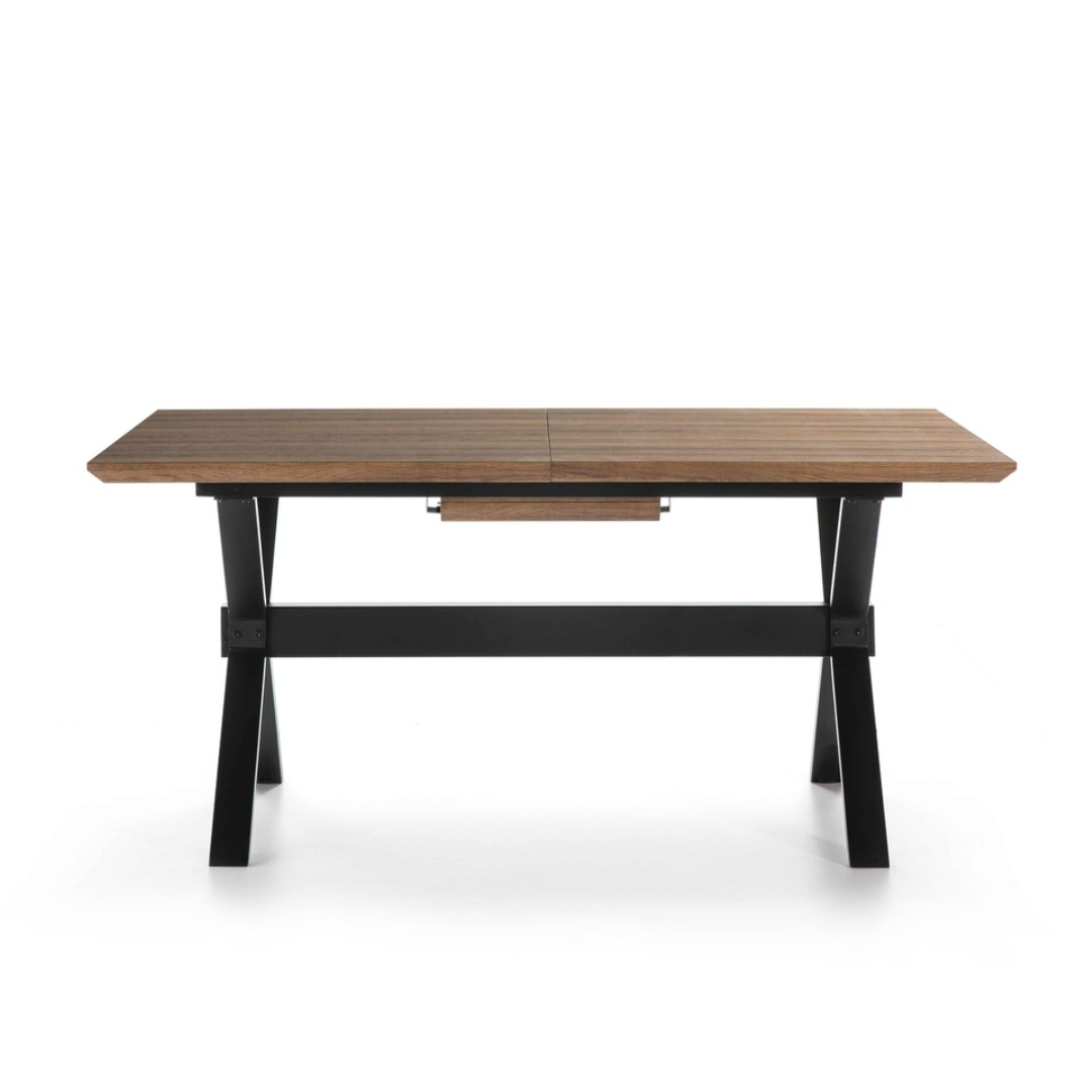Mesa de comedor de laminado de madera de nogal y patas de aluminio lacado negro.