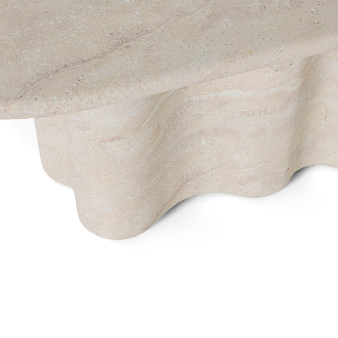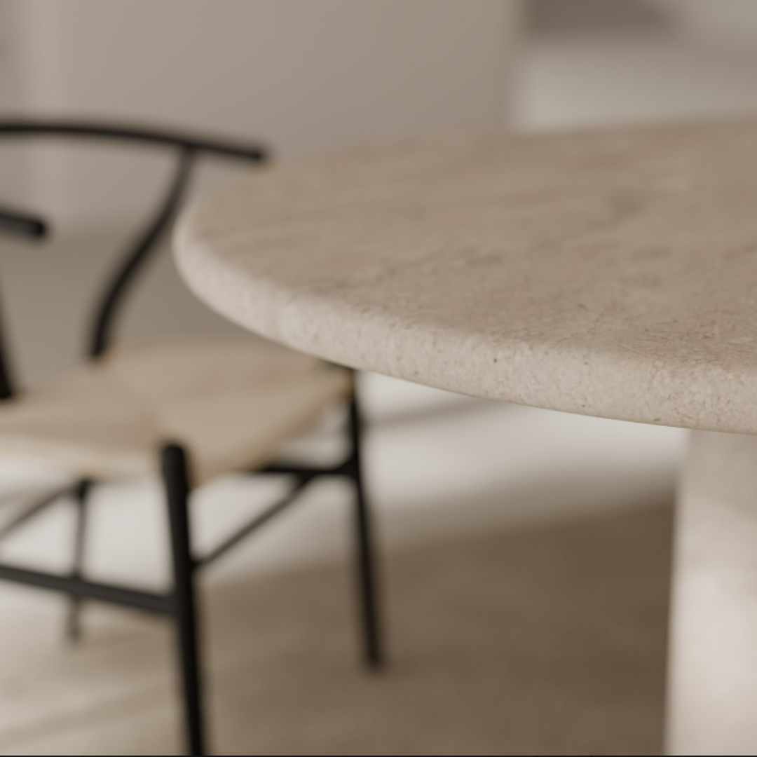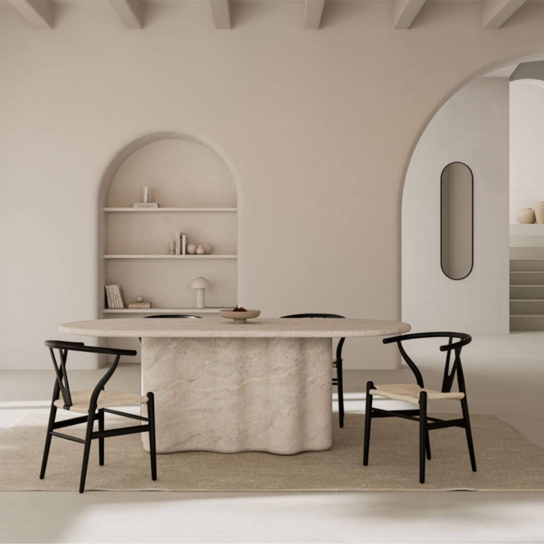 La mesa LORRAINE es una pieza escultórica de diseño contemporáneo, completamente elaborada en cemento-GFRC (reforzado con fibra de vidrio) con un sofisticado acabado mármol travertino, que aporta una estética natural, elegante y atemporal. Su presencia imponente se ve reforzada por sus generosas dimensiones —220 cm de ancho y un grosor de 4,2 cm en la tapa—, convirtiéndola en el centro indiscutible de cualquier espacio.