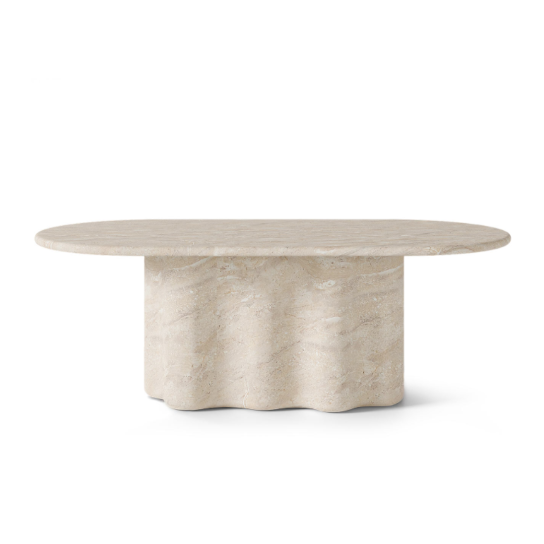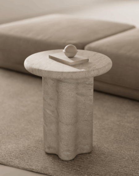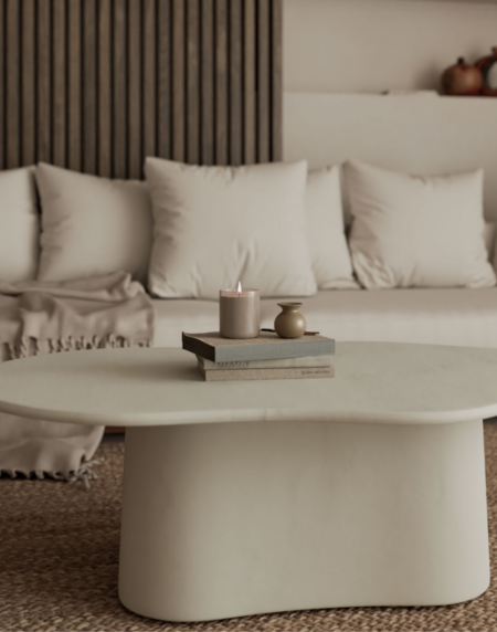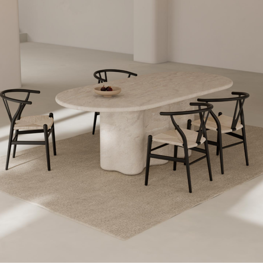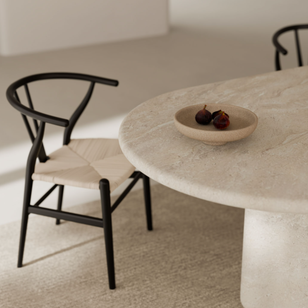 La mesa LORRAINE es una pieza escultórica de diseño contemporáneo, completamente elaborada en cemento-GFRC (reforzado con fibra de vidrio) con un sofisticado acabado mármol travertino, que aporta una estética natural, elegante y atemporal. Su presencia imponente se ve reforzada por sus generosas dimensiones —220 cm de ancho y un grosor de 4,2 cm en la tapa—, convirtiéndola en el centro indiscutible de cualquier espacio.