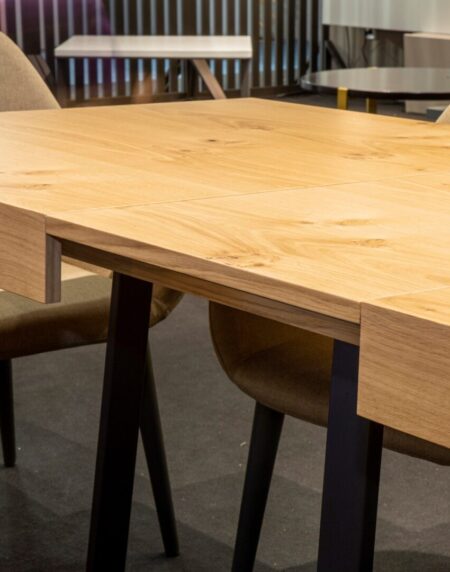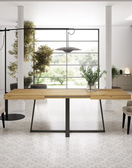 La mesa 2 en 1:Mesa multifuncional de centro convertible en mesa de comedor, con pie de madera y sobre extensible en chapa natural o melamina. Opción canto redondo o recto.