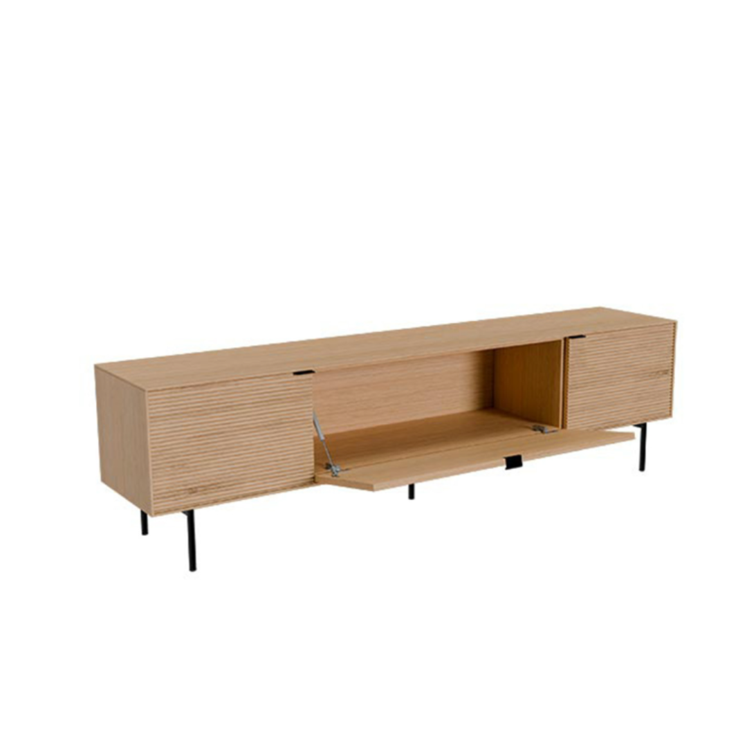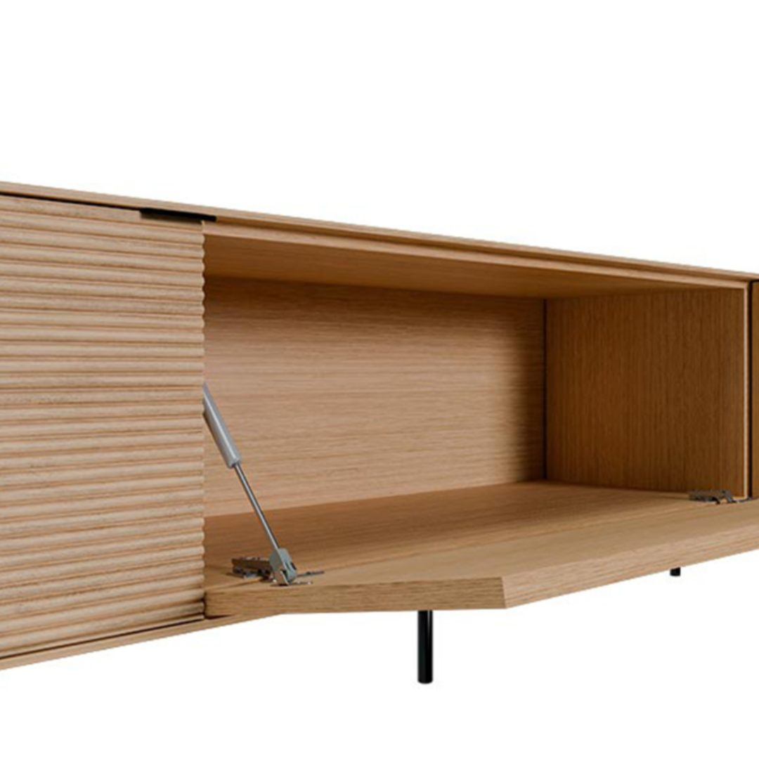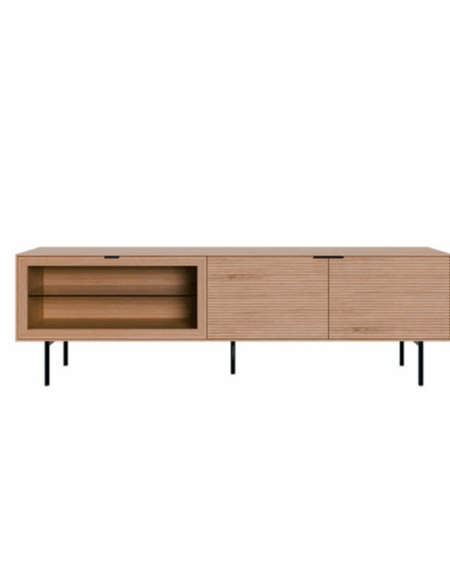 Su estructura en chapa de roble se armoniza con los frentes en madera maciza de roble rayado, aportando un efecto visual cálido y texturizado que realza el conjunto. Las patas metálicas en color negro, junto a los tiradores metálicos y el sistema soft closing, refuerzan su estilo contemporáneo y su facilidad de uso. Una opción ideal para salones que buscan una pieza robusta, elegante y atemporal.