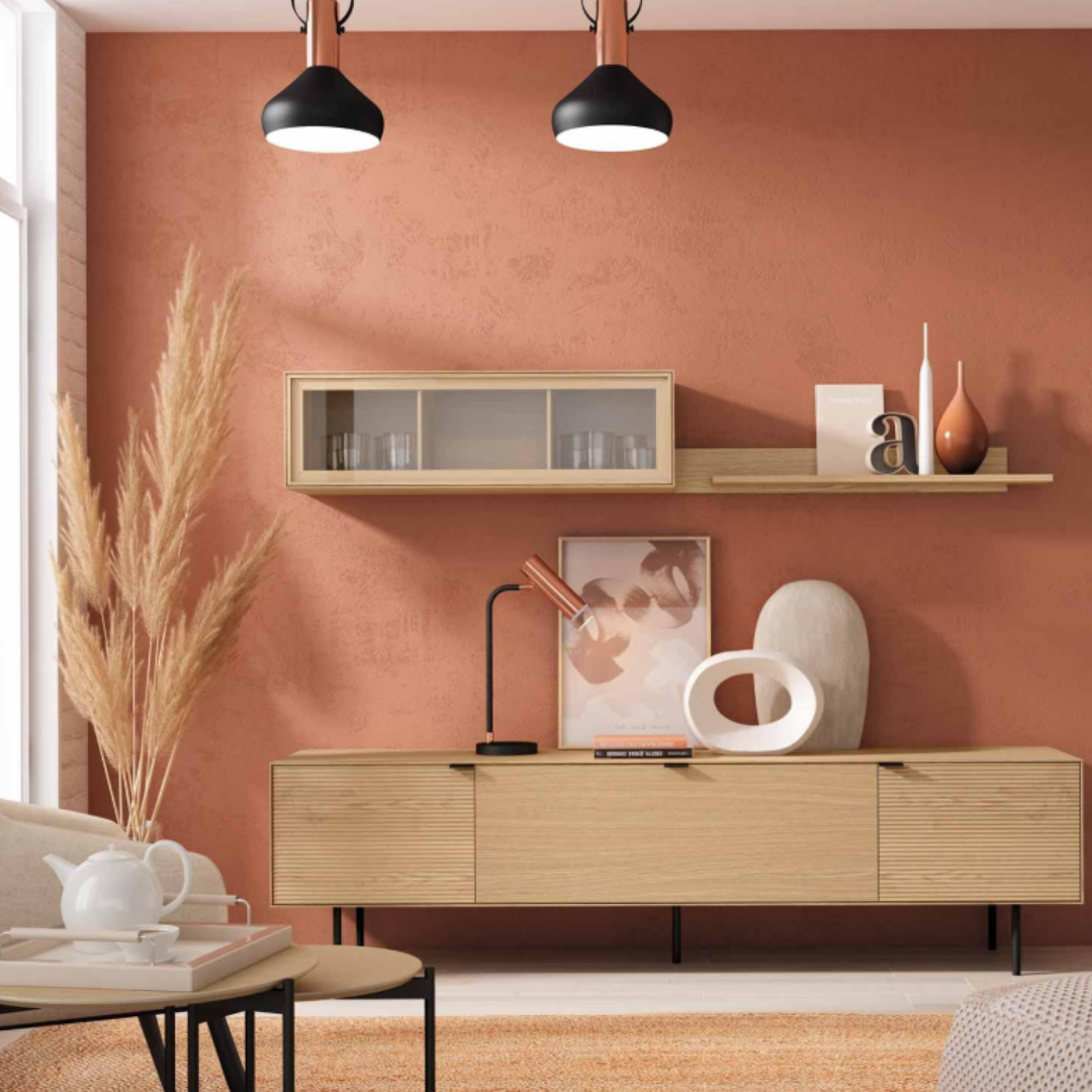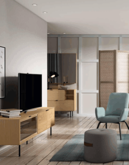 El mueble de TV TULSA de 200 cm presenta una propuesta sofisticada que combina funcionalidad y diseño natural. Con tres puertas —una de ellas abatible—, ofrece una solución práctica para mantener los dispositivos y accesorios audiovisuales ordenados y ocultos, sin renunciar a la estética.