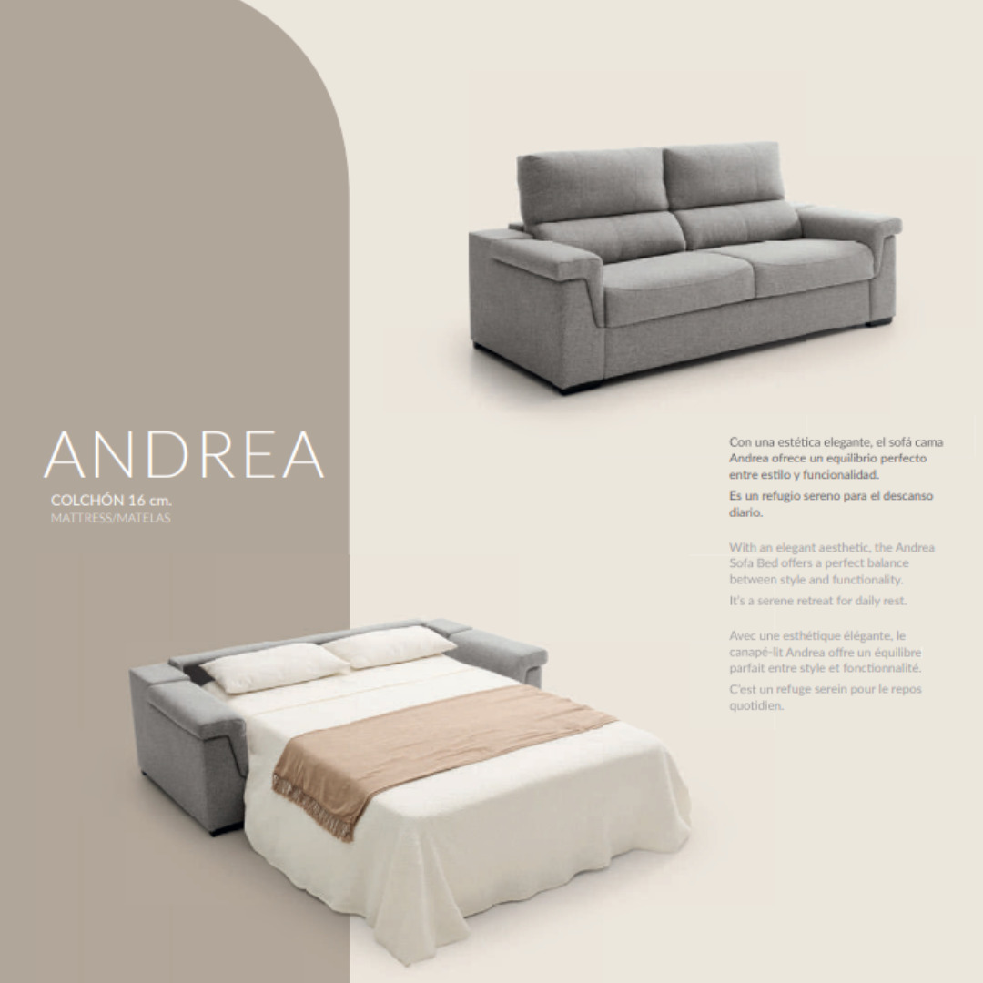 Con una estética elegante, el sofá cama Andrea ofrece un equilibrio perfecto entre estilo y funcionalidad.