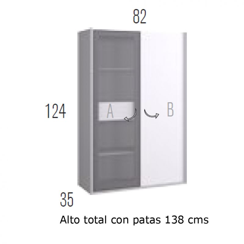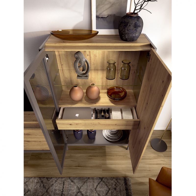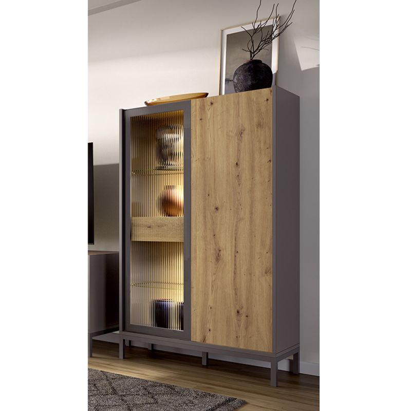 Vitrina singular de melamina acabada en color Nordic y Grafito con patas