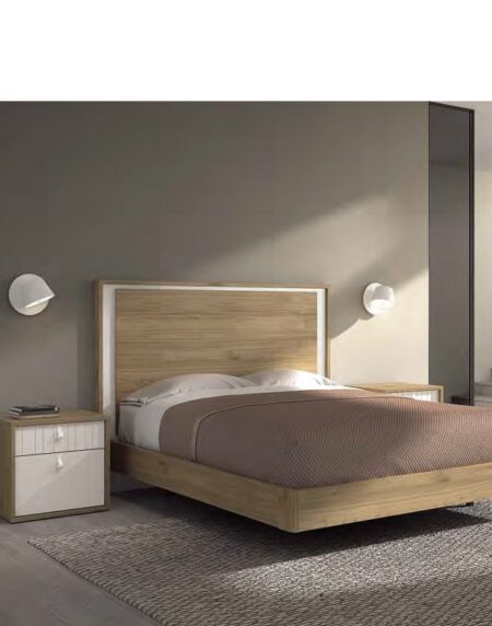 Dormitorio acabado melamínico en color Siena y Blanco, con Cabezal + aro de cama para colchón de 150x190 + 2 mesitas de 1/c y 1/cont.