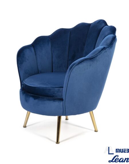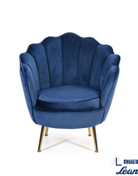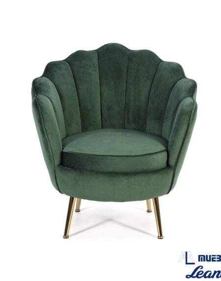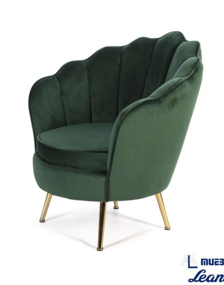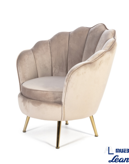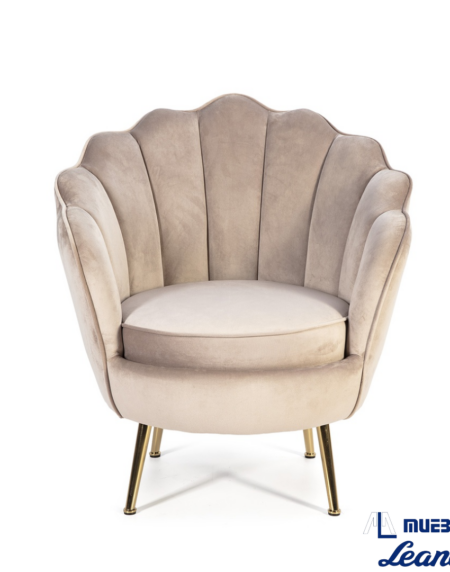 Butaca en tela de terciopelo color beige/rosado en forma de concha ideal para decorar cualquier estancia. Bien sea un salón o un dormitorio combinado en este tono. Tiene un asiento acolchado y sus patas son de metal lacado en dorado para darle un toque de elegancia al sillón.