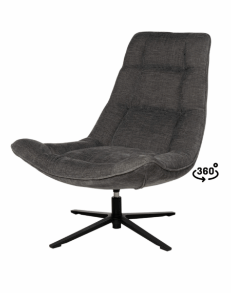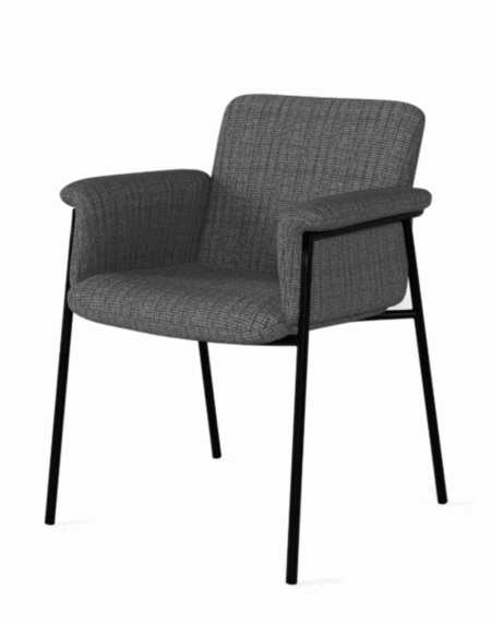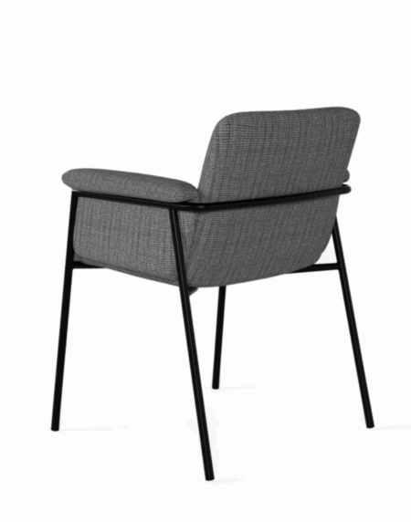 La silla CAROLYN presenta un diseño moderno y minimalista, destacando su amplio asiento y respaldo, completamente tapizados en una tela gris oscuro acolchada que garantiza comodidad y fácil mantenimiento.