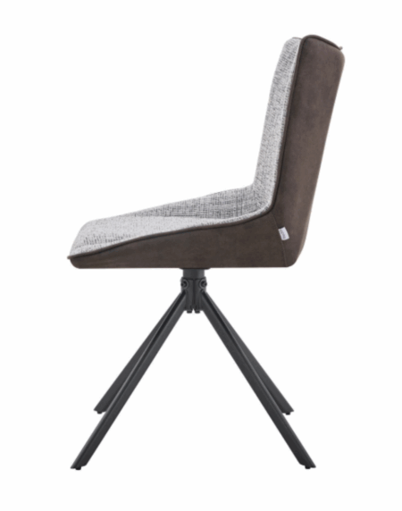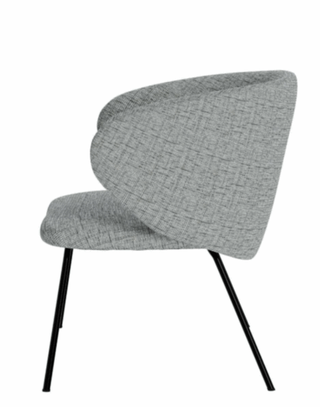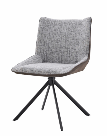 La silla ALESSIA combina su asiento y respaldo tapizados en un tejido texturizado gris claro con una capa exterior que simula antelina, proporcionando una textura suave y agradable al tacto.
