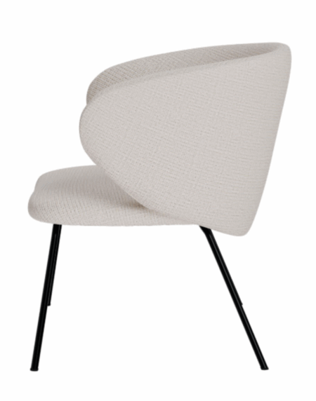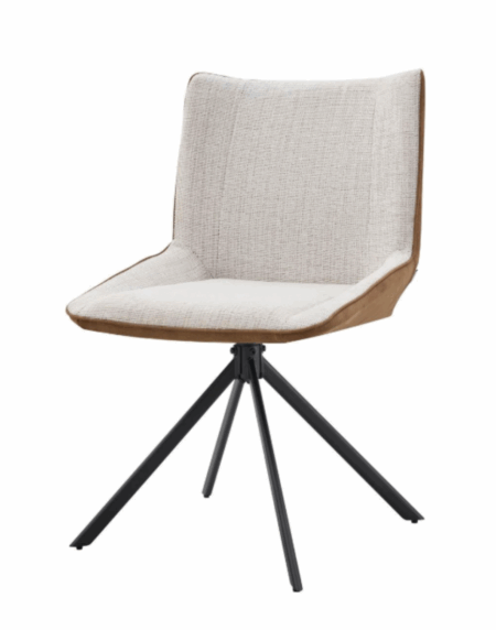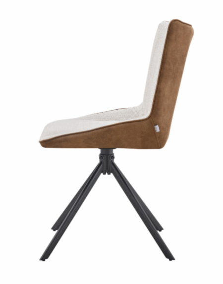 La silla ALESSIA combina su asiento y respaldo tapizados en un tejido texturizado beige con una capa exterior que simula antelina, proporcionando una textura suave y agradable al tacto.