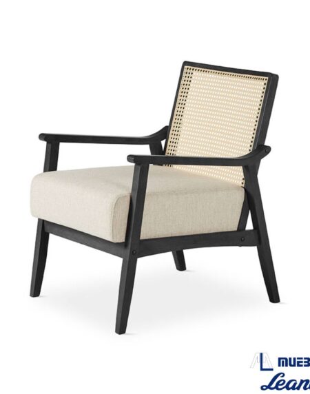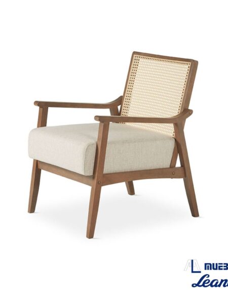 Silla de madera natural maciza con brazos y respaldo de rejilla y el asiento tapizado con un gran grosor para una buena sentada.