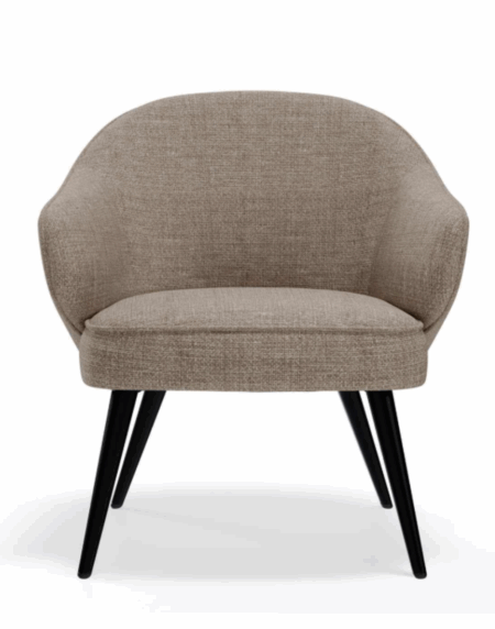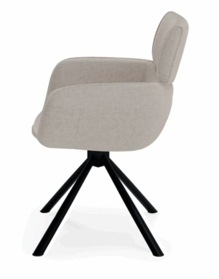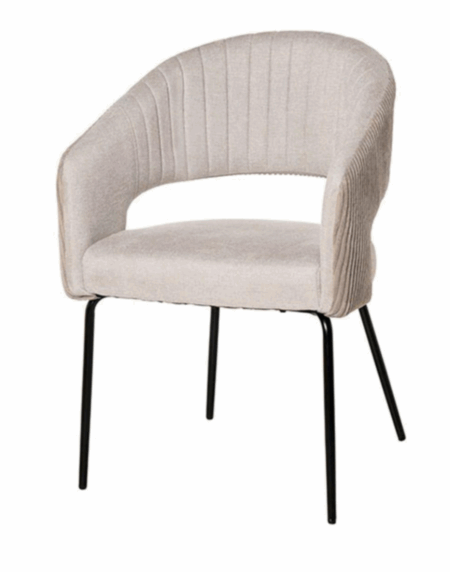 La silla CAROLYN presenta un diseño moderno y minimalista, destacando su amplio asiento y respaldo, completamente tapizados en una tela taupe acolchada que garantiza comodidad y fácil mantenimiento.