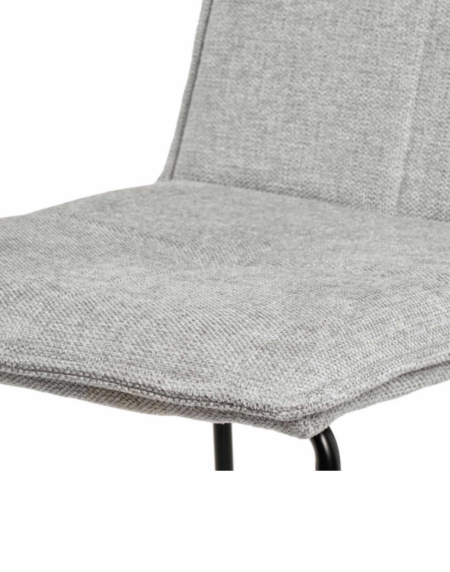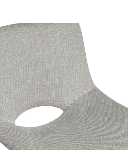 Su estructura está compuesta por patas de metal y un tapizado de tela en color gris claro (100% poliéster), con una ligera curvatura en el respaldo que proporciona mayor comodidad.