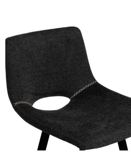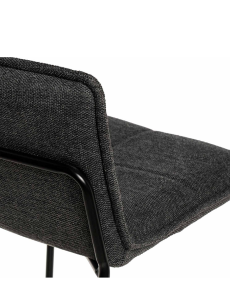 Su estructura está compuesta por patas de metal y un tapizado de tela en color gris oscuro (100% poliéster), con una ligera curvatura en el respaldo que proporciona mayor comodidad.
