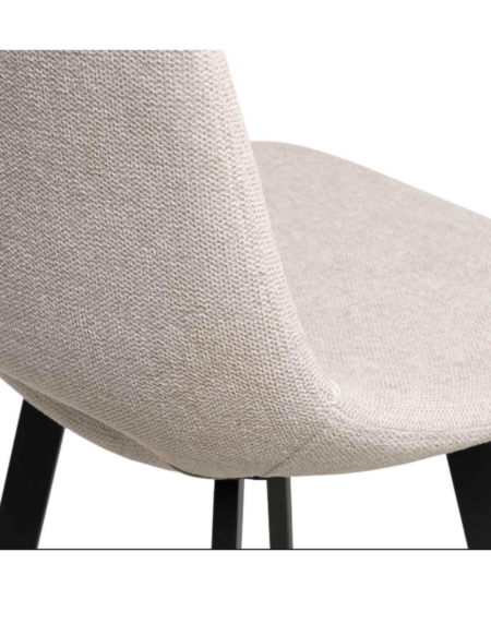Su estructura está compuesta por patas de metal y un tapizado de tela en color beige (100% poliéster), con una ligera curvatura en el respaldo que proporciona mayor comodidad.