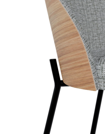 Su respaldo, tapizado en color gris (100% poliéster) y con una parte trasera en chapa de madera, no solo proporciona un excelente soporte para la espalda, sino que también añade un toque de calidez y sofisticación.