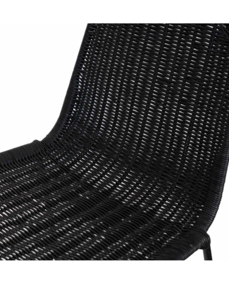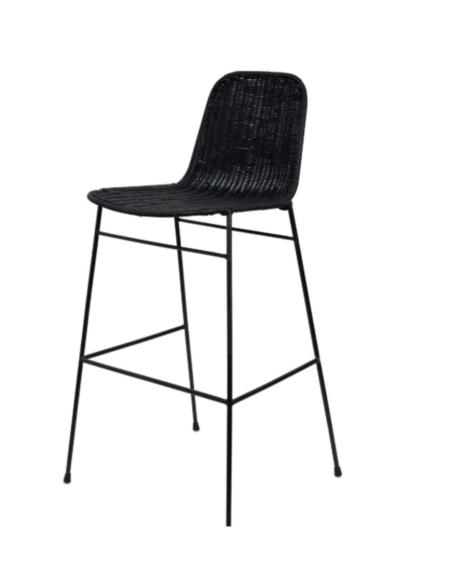 El taburete CARLO destaca por su elegancia y diseño sofisticado, gracias a su acabado completamente en negro, que abarca tanto su estructura de ratán como sus resistentes patas de hierro.