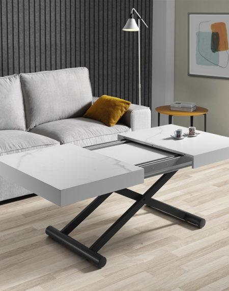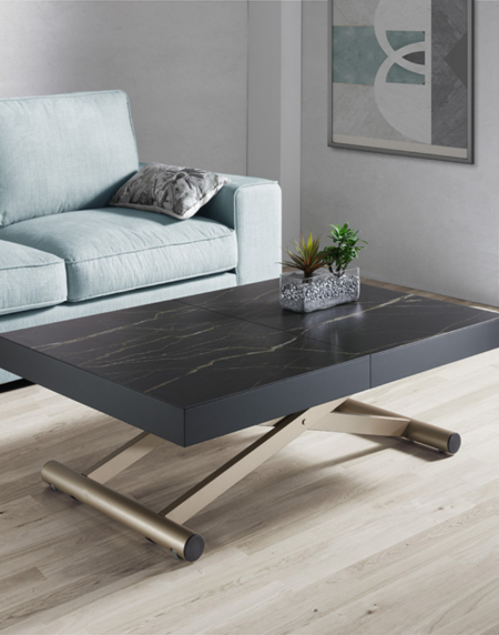Modernidad y elegancia entre metal, madera y pordelánico, un modelo funcional y sofisticado regulable en altura y apertura, donde mesa de centro y comedor se funden en una, para optimizar el espacio.