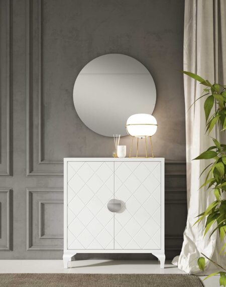 El Taquillón modelo 41 Forever es un mueble de recibidor con 2 puertas con tirador PUSH en forma de U que se integran alrededor de dos cajones. Este mueble es de estilo moderno, con líneas rectas y diseño muy elegante. El precio indicado corresponde a un mueble con zócalo. Existe la posibilidad de poner patas chippendale o