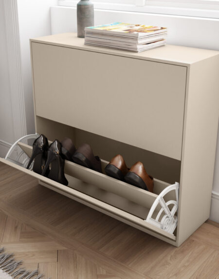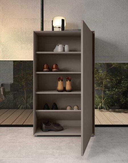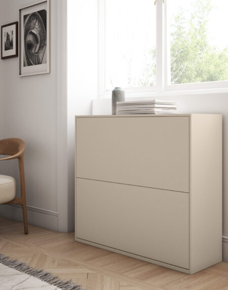 El Zapatero twenty FOREVER es un mueble zapatero con dos puertas y un cajón. Este mueble auxiliar de estilo moderno y diseño elegante, está disponible con zócalo o con patas (con incremento de precio). Disponible en una amplia gama de acabados.