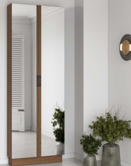 Zapatero con dos puertas de cristal de espejo y capacidad para hasta 18 pares de zapatos. Las puertas son de madera de nogal
